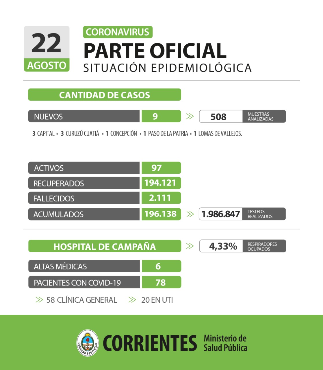 Los nuevos casos son: 3 Capital – 3 Curuzú Cuatiá – 1 Concepción – 1 Paso de la Patria – 1 Lomas de Vallejos.