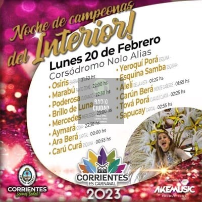 Desde la empresa organizadora de los carnavales informaron que participarán 11 comparsas del interior, la campeona del carnaval de la ciudad de Corrientes, Ara Berá y Sapucay.